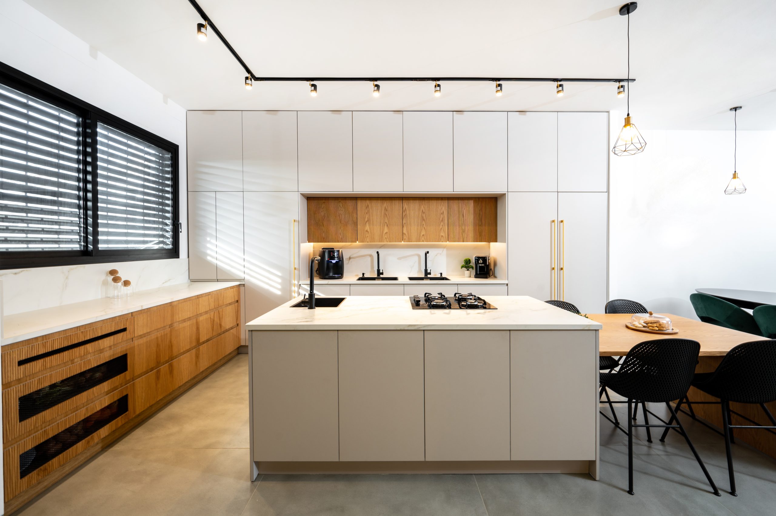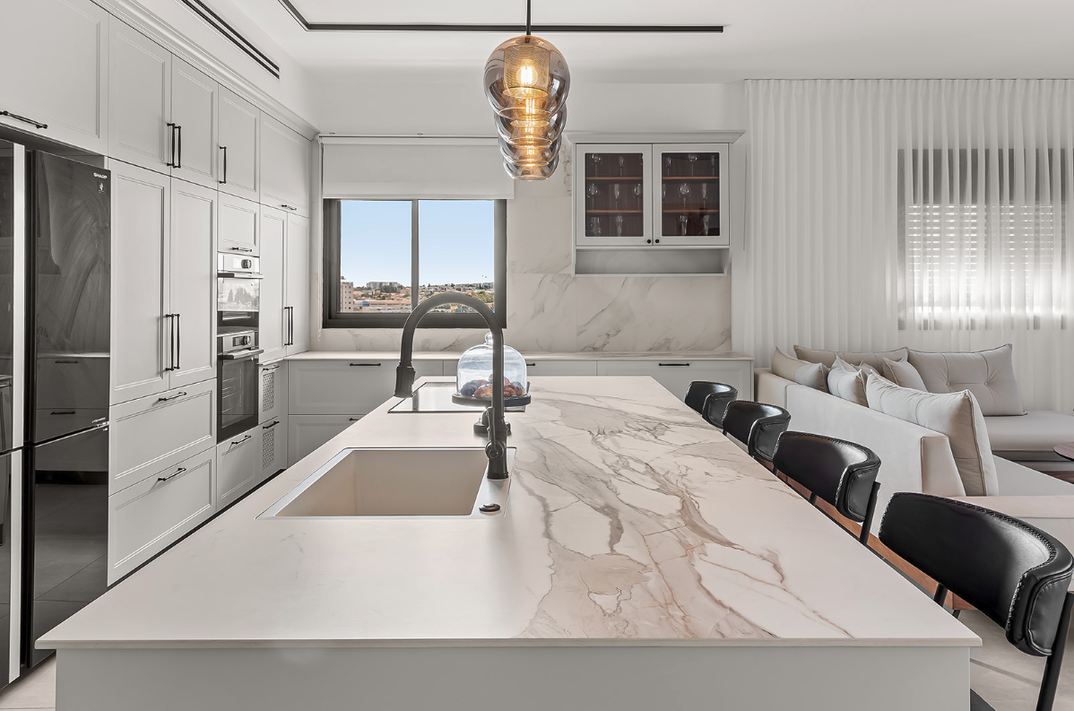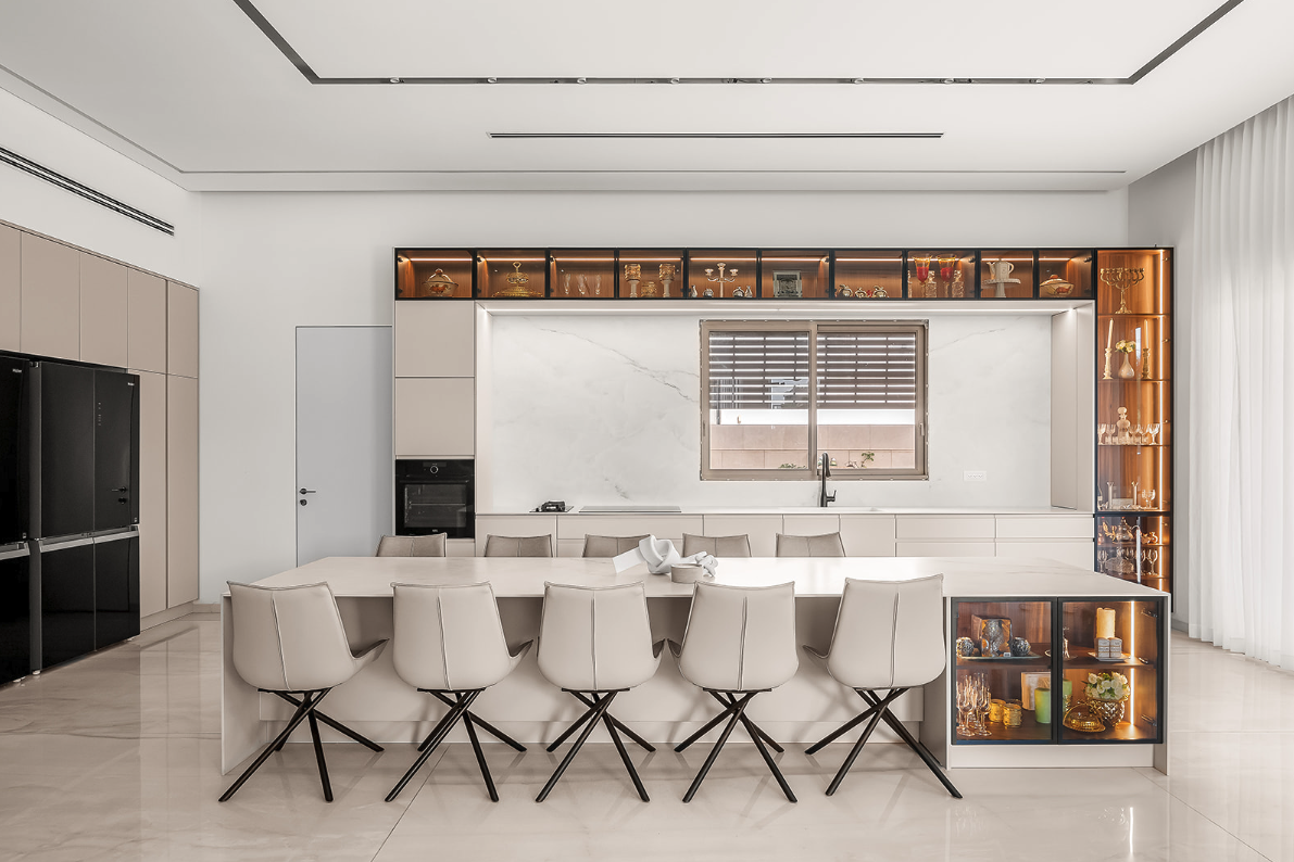 חלוקה ברורה לאזורים (בישול, הכנה, הגשה), אחסון נגיש ליומיומי ושילוב אי משפחתי שמחבר בין בישול לישיבה משותפת.