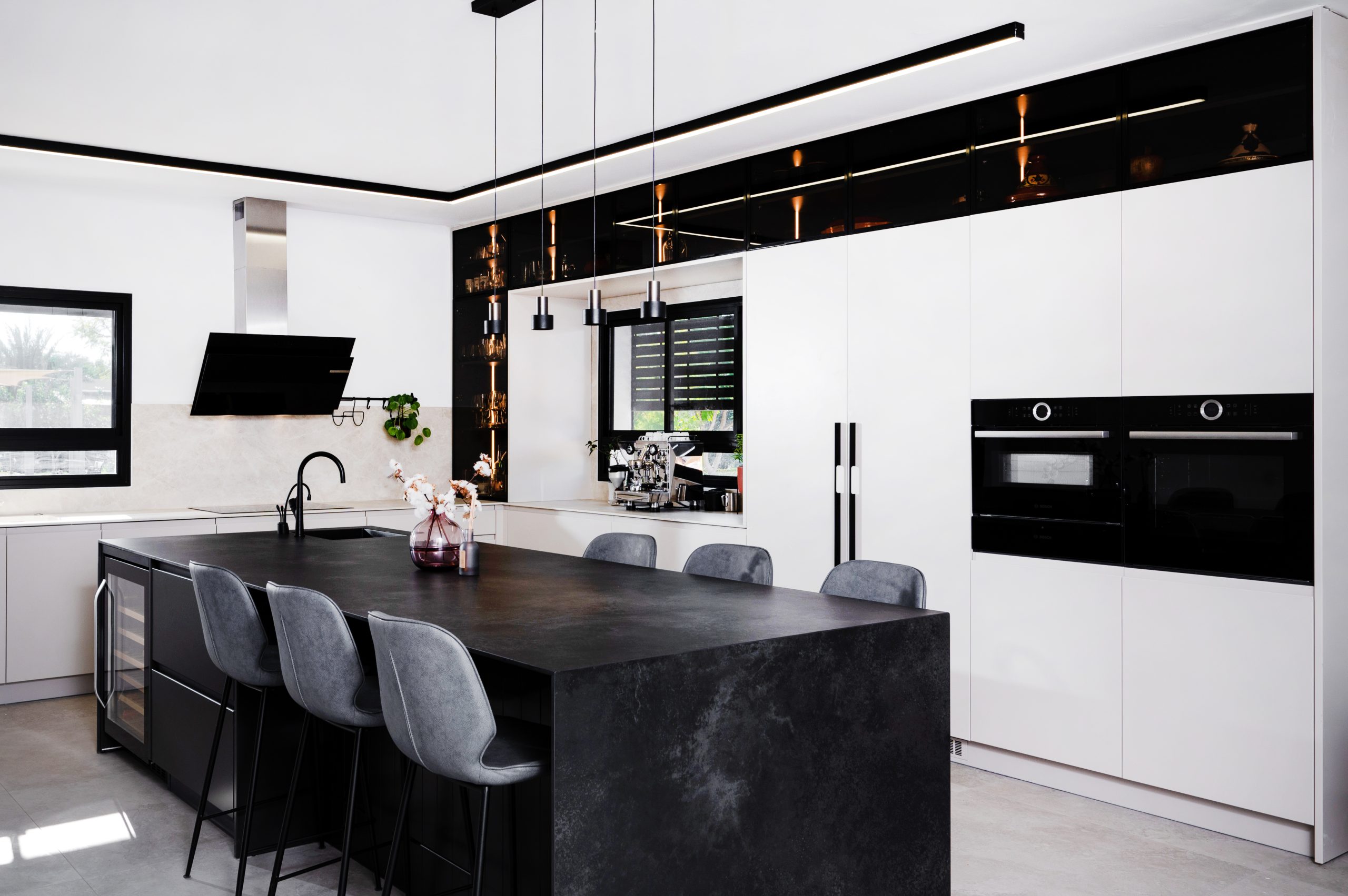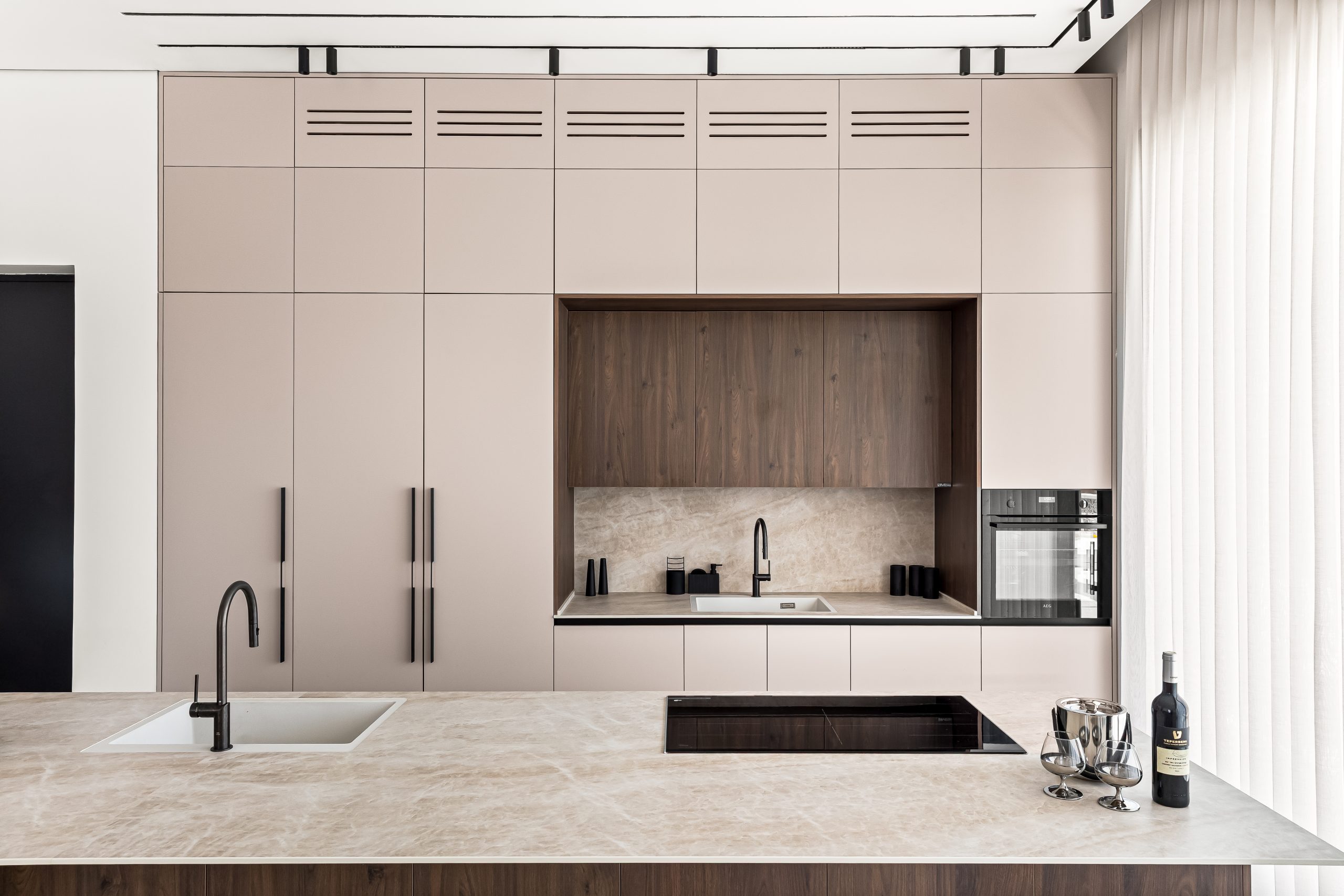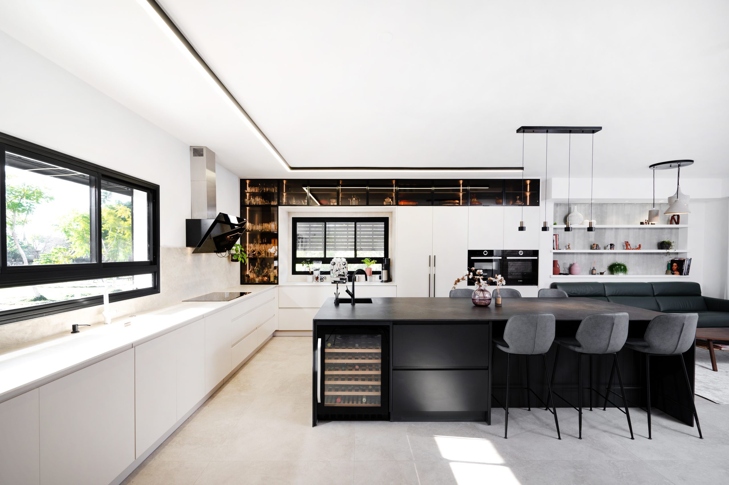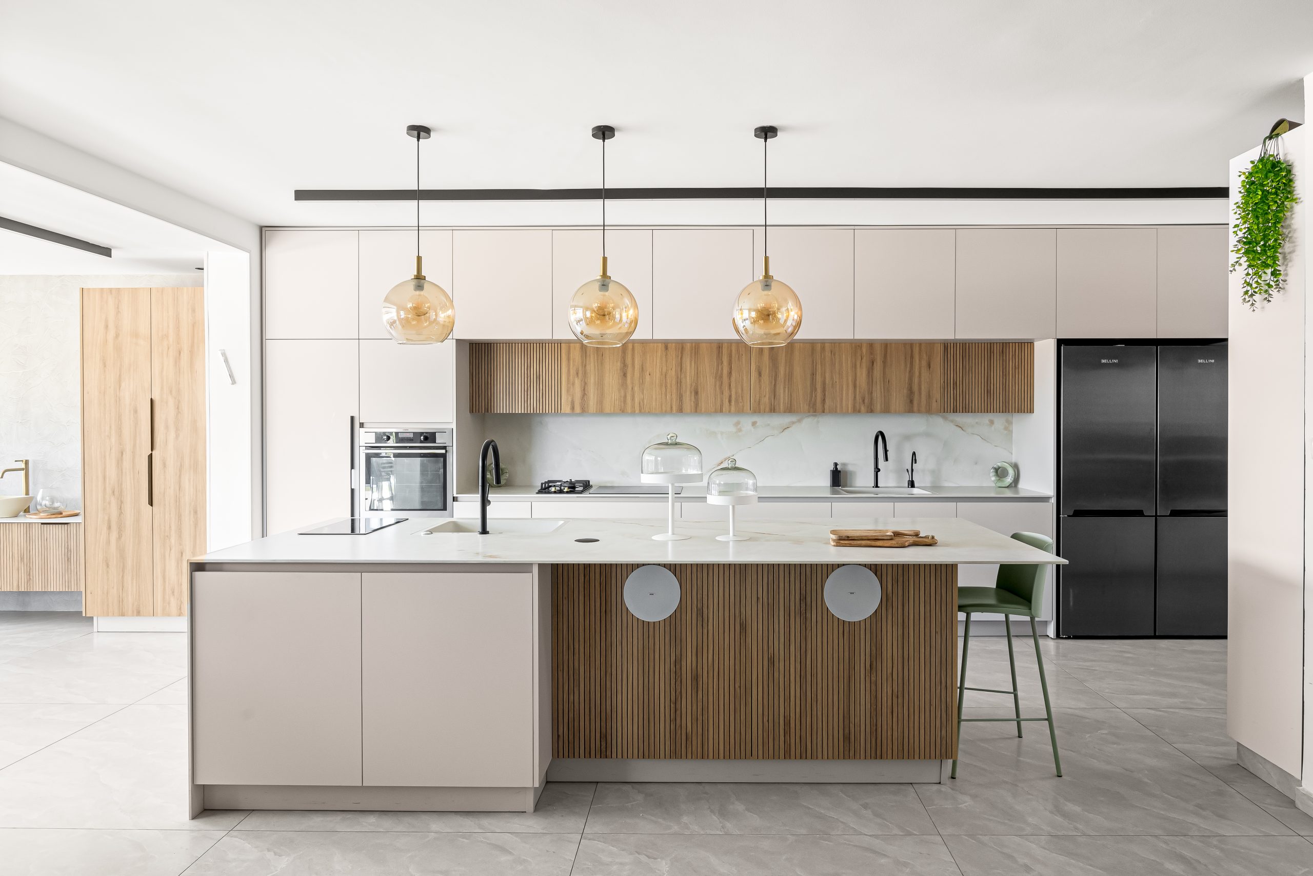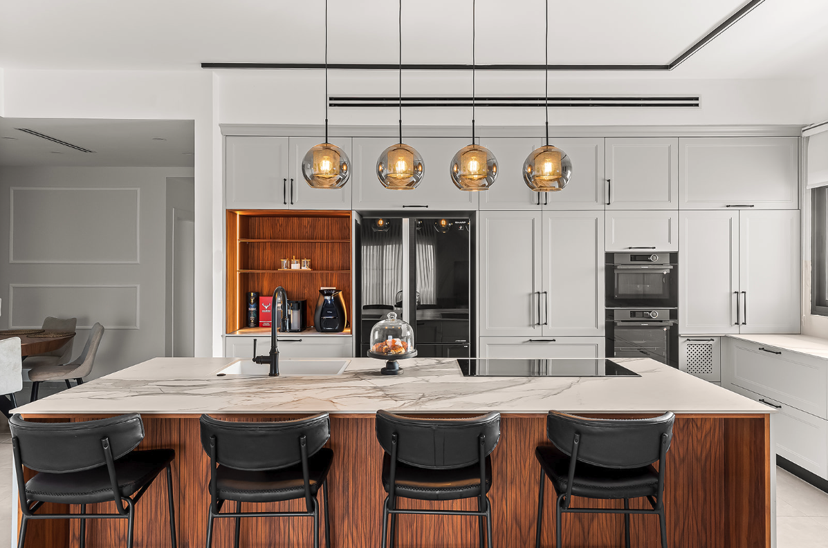 - שילוב מכשירי חשמל אינטגרליים ש"נמסים" בתוך הארונות ושומרים על מראה אחיד ורציף.