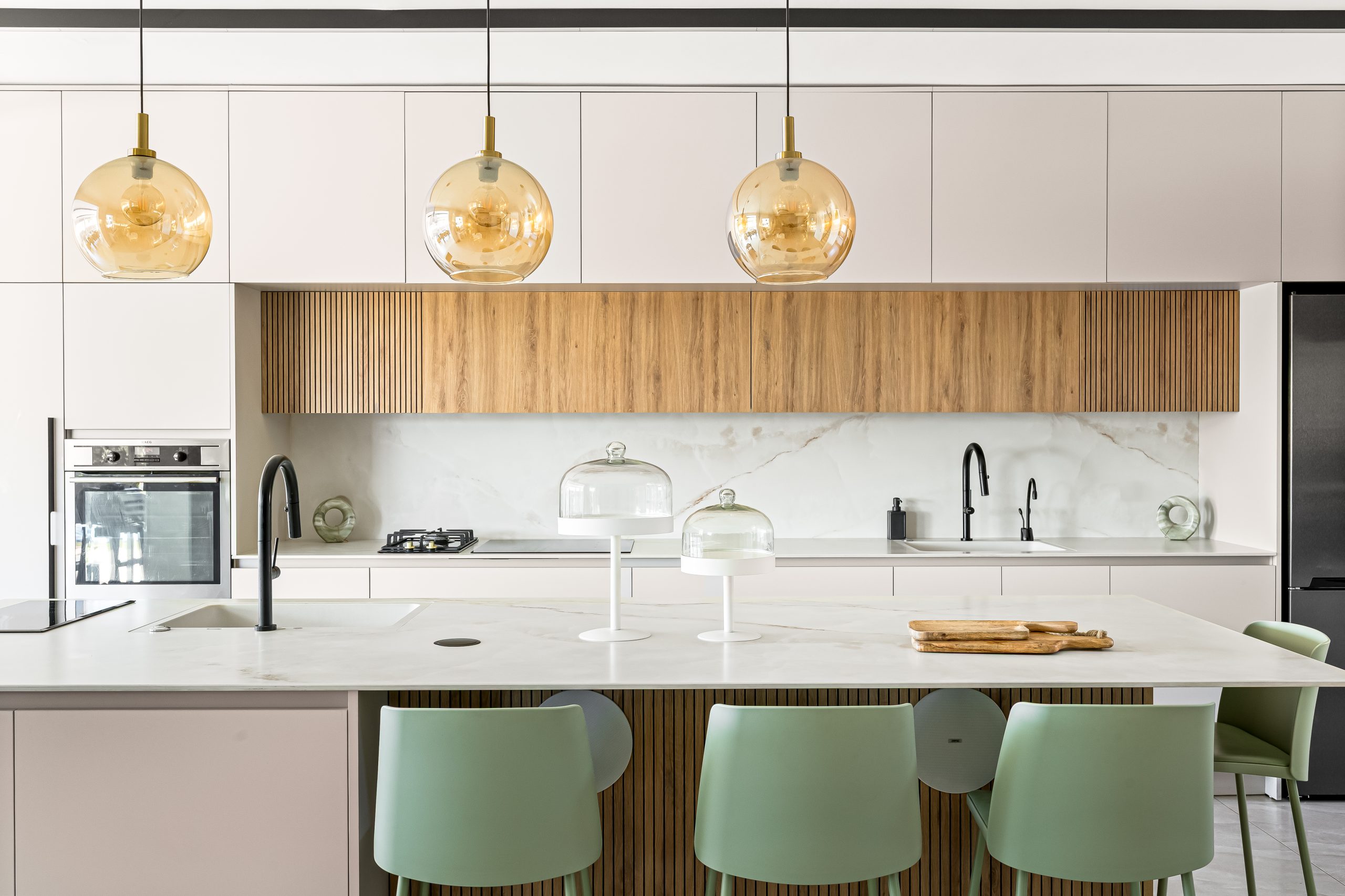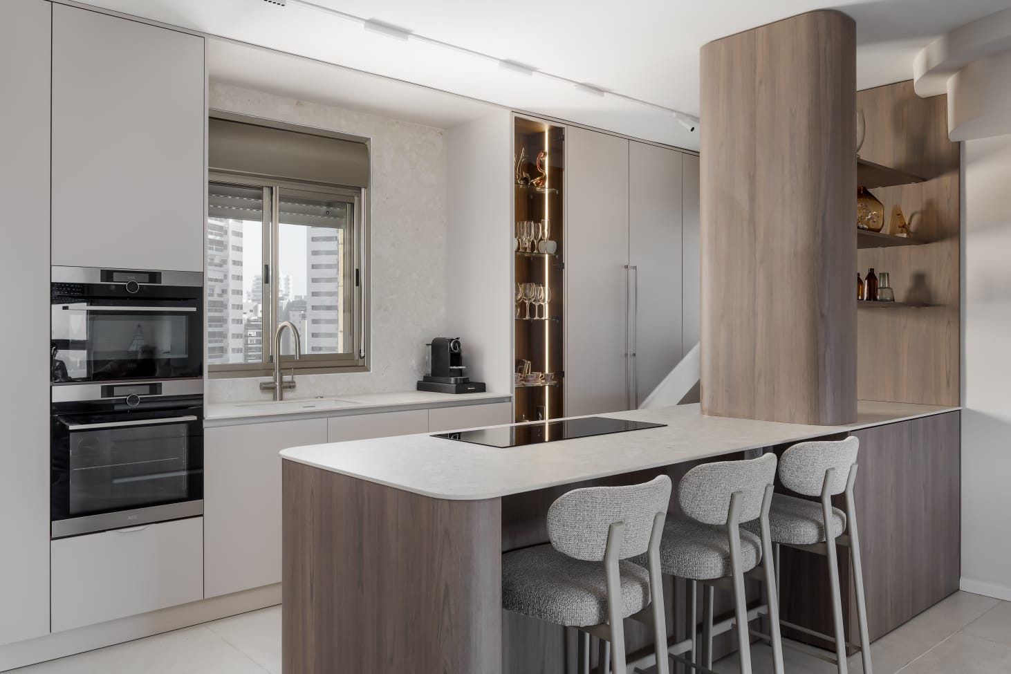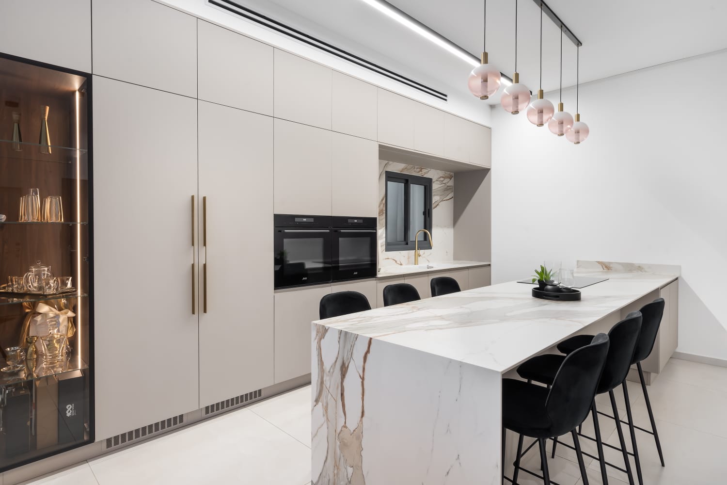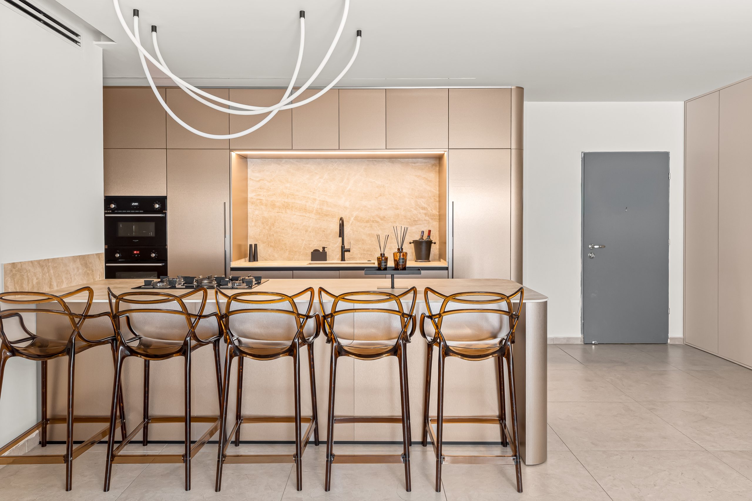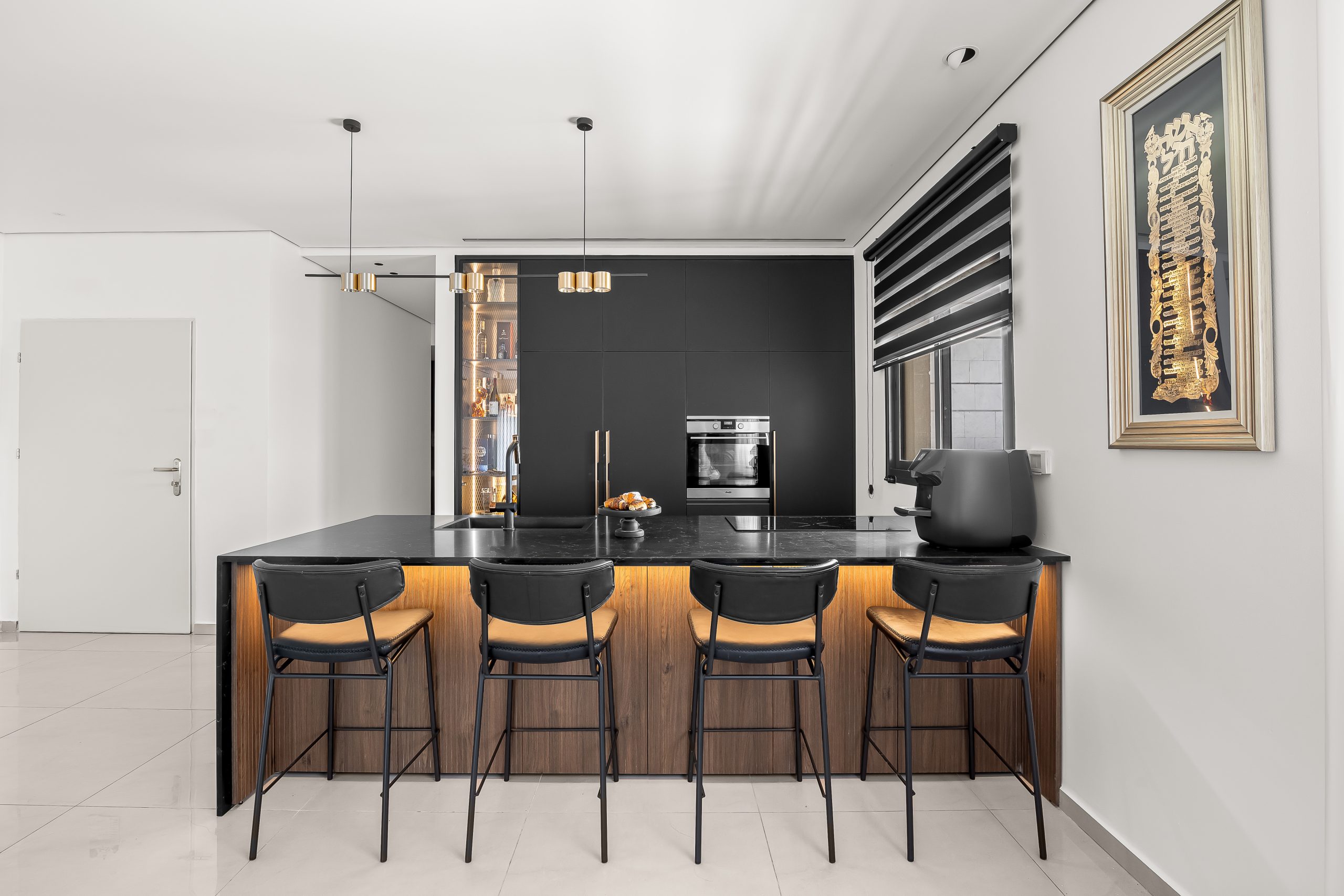 - שילוב מכשירי חשמל אינטגרליים ש"נמסים" בתוך הארונות ושומרים על מראה אחיד ורציף.