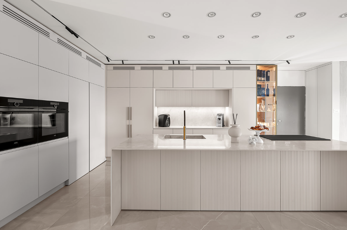 שפה עיצובית המשכית לסלון, חזיתות נקיות ומכשירים אינטגרליים המייצרים חלל אחד אחיד, מודרני והרמוני.